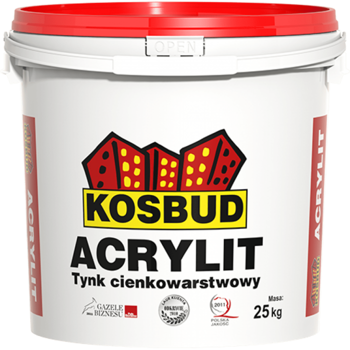 Тонкослойная акриловая штукатурка ACRYLIT с текстурой «овечья шкура/короед» для наружных стен. Отличается устойчивостью к царапинам и ударам, а также высокой гибкостью. Легко наносится и, по отзывам клиентов, обладает самой красивой текстурой на рынке. Используется для ручной отделки наружных фасадов на армированных сеткой слоях в системе теплоизоляции KOSBUD SYSTEM. Акриловая штукатурка ACRYLIT богата специальными добавками, улучшающими ее свойства. Наличие слюды обеспечивает ей 30% устойчивость к ультрафиолетовому излучению, предотвращая выцветание и сохраняя насыщенный цвет в течение длительного времени. Кроме того, функциональный минерал усиливает связывание и гидрофобность, предотвращая растекание воды по поверхности штукатурки, но собирая и скатывая пыль, подобно жирному ковшу. В результате фасад устойчив к загрязнениям и остается чистым. Специальная формула KOSBUDPROTECT, содержащаяся в штукатурке, защищает фасад от развития микроорганизмов, таких как грибки и водоросли.